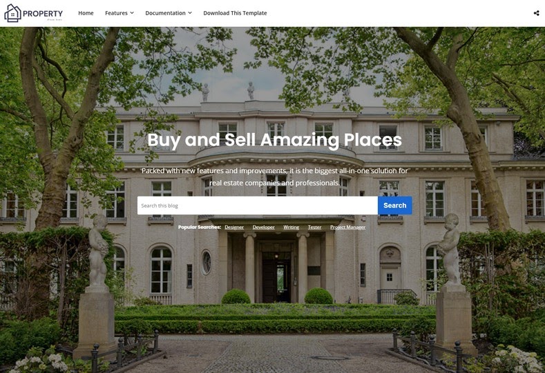 房地产博客模板提供干净、现代的设计,非常适合房地产和房地产博客。主页设有全角搜索栏,可帮助访问者快速找到房产列表。
